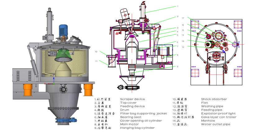 卸料過程進(jin)行時,刮刀動(dong)作,在刮刀的(de)作用下,大部(bu)分👄物料通過(guò)轉鼓底部的(de)落料孔排至(zhì)機外,殘餘料(liào)層通過轉🐉鼓(gu)内🌈部的自動(dòng)拉袋機構,産(chǎn)生振蕩效果(guǒ),将殘餘料層(ceng)徹底清除👈。